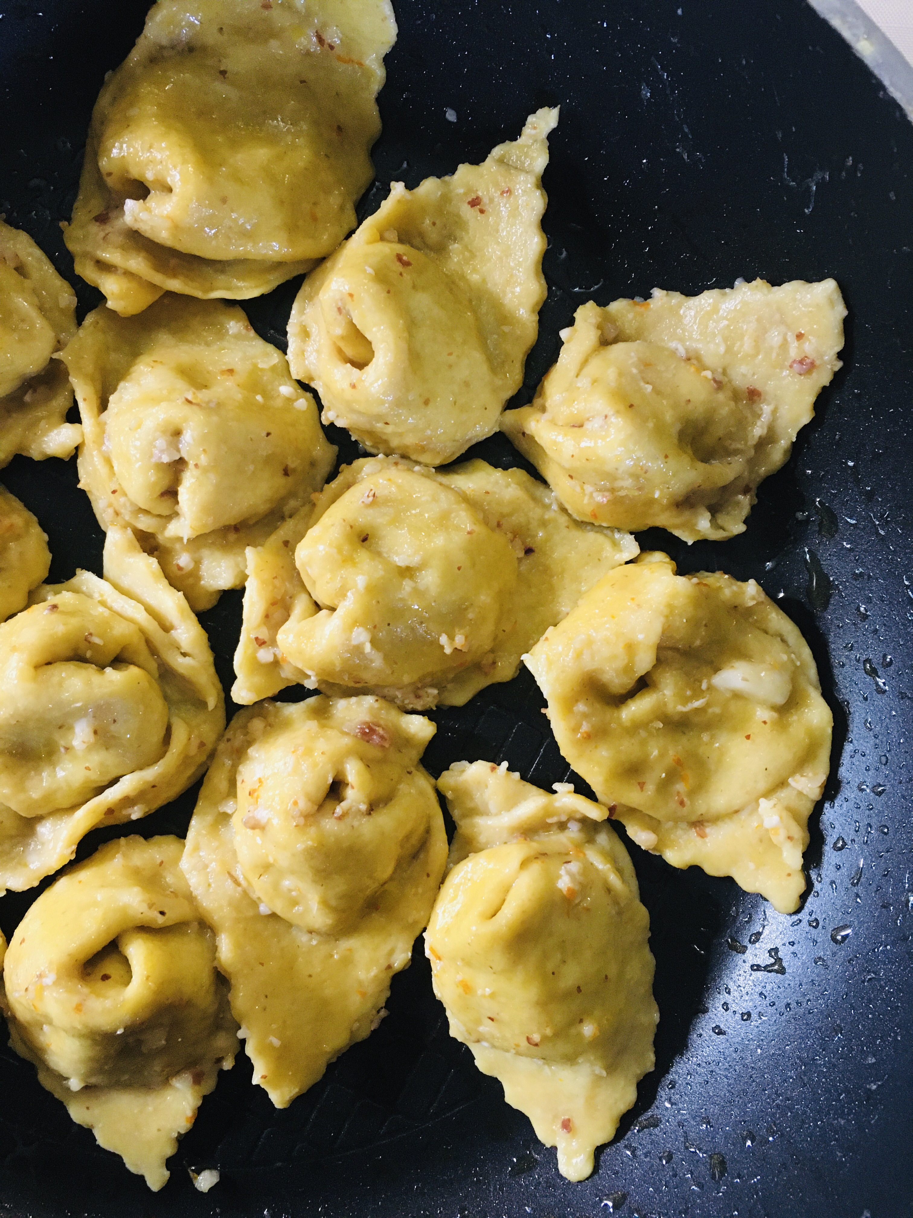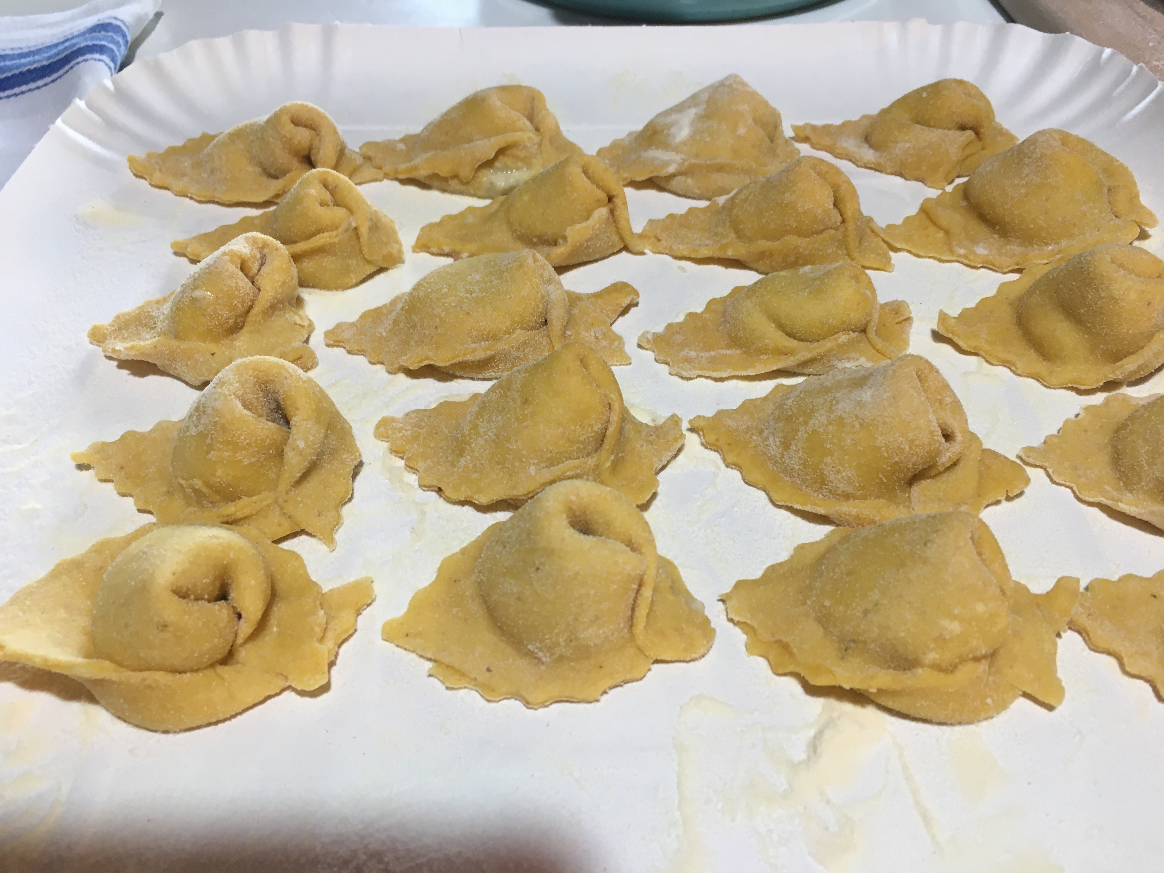 Ho ripreso la pasta, l’ho stesa con la macchinetta della pasta in uno spessore sottile, ho tagliato a quadrati unendo un po’ di ripieno di gobbi e robiola. Ho chiuso ogni scacco a triangolo e chiuso come un cappelletto ma molto più grande. Ho continuato così fino ad esaurimento degli ingredienti.