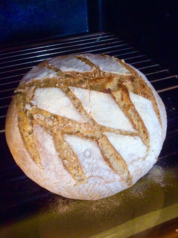 Un giorno sì è un giorno no, mi rilascio lavorando il pane col mio lievito madre ormai con anni sulle spalle e sempre bello pimpante. Il pane ha bisogno di una lunga lievitazione ed una accurata e controllata cottura. Mi piace guardare la sua miracolosa crescita una volta messo in forno. A volte può succedere che non sia il massimo e questo mi dà molto dispiacere. Ma come la vita ha degli alti e bassi. Non facciamoci caso e tiriamo avanti. Per oggi, è andata! Grazie a Dio!