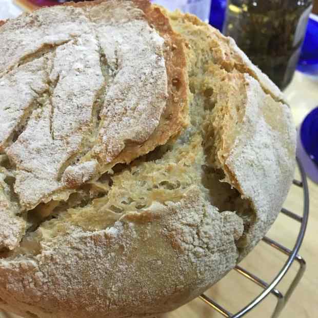Impastato a mano per pochi minuti poi girato in ciotola per tutta la circonferenza tirando un lembo alla volta, fatto riposare e continuato a fare i giri ogni mezz’ora per un totale di 4 volte. Sgonfiato, fatto altre pieghe in tre e formato la pagnotta, fatto lievitare fino al raddoppio e cotto in pentola di coccio per un’ora.