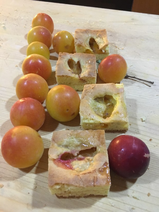 Lasciamo freddare completamente nello stampo. Tagliamo a quadrotti il dolce facendo attenzione a lasciare intera la susina.
