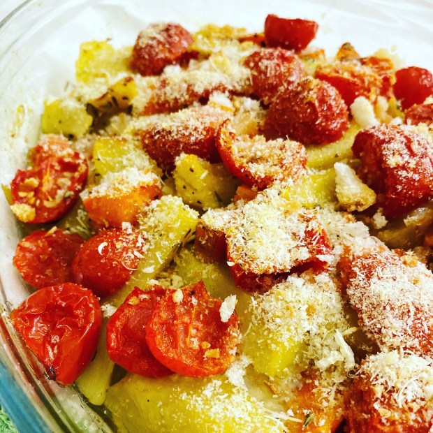 Ecco il nostro pasticcio con qualche modifica, fra “sólà e sólà”, abbiamo messo anche una granella di noci che stanno per scadere, chiuso con le patate ed i pomodorini cosparsi di pangrattato. Messo in forno e portato in tavola.
