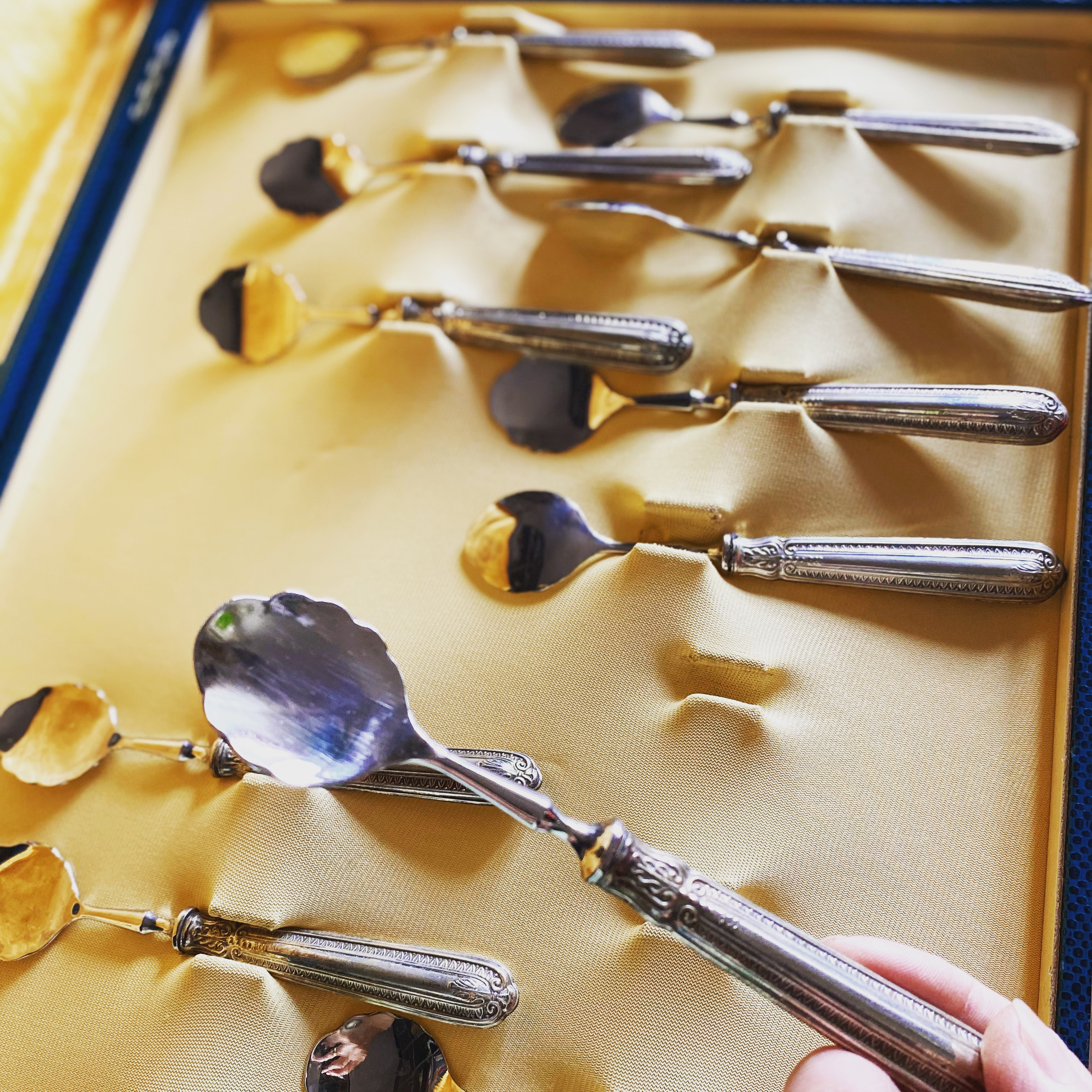 Io ho ancora molti di questi doni, alcuni custoditi nelle loro scatole preziose blu o rosso bordeaux. Questi sono i cucchiaini d’argento per il gelato.