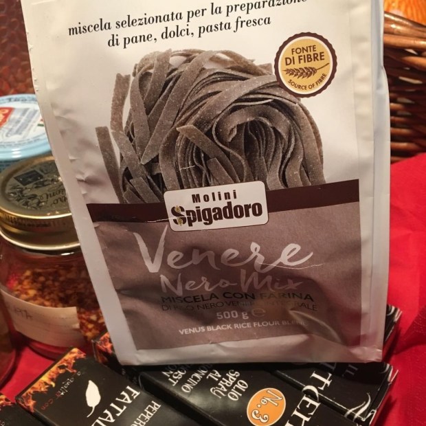 Per fare questa pasta fresca all’uovo, usiamo una parte di farina nera di riso Venere ed una parte di semola rimacinata di grano impastata con le uova di galline felici, beate loro. Il procedimento è uguale ad una comune pasta fresca all’uovo.