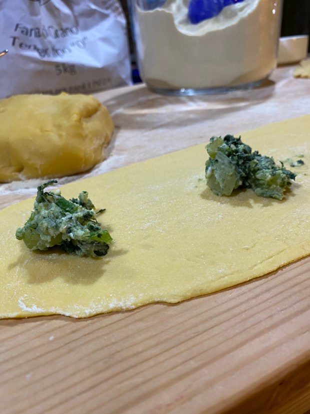 Stendiamo la pasta nella macchinetta prima nel rullo spesso, poi in quello sottile adatto ad ottenere una sfoglia giusta per il ripieno. Facciamo le strisce, mettiamo un cucchiaio di ripieno sopra, tagliamo a scacchi e chiudiamoli a triangoli.