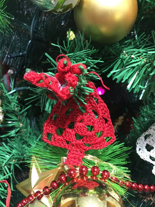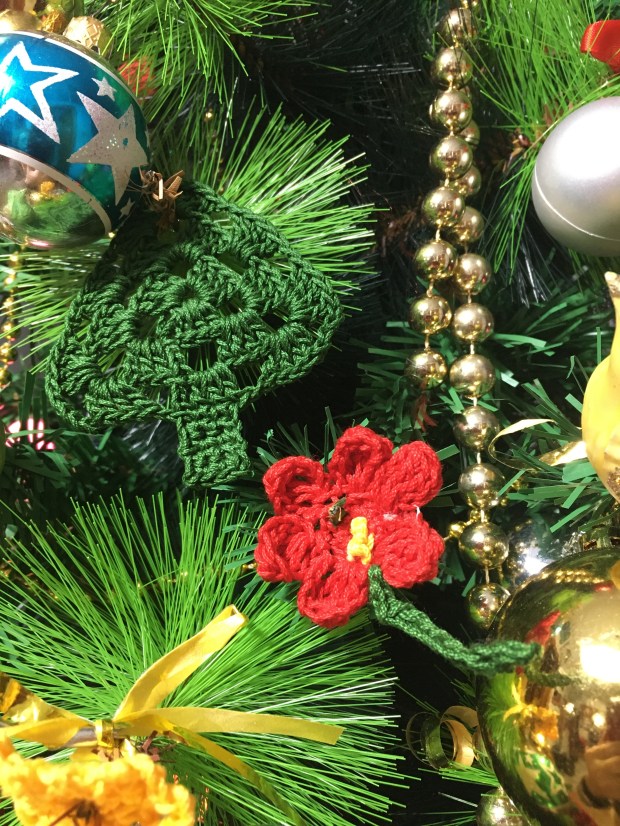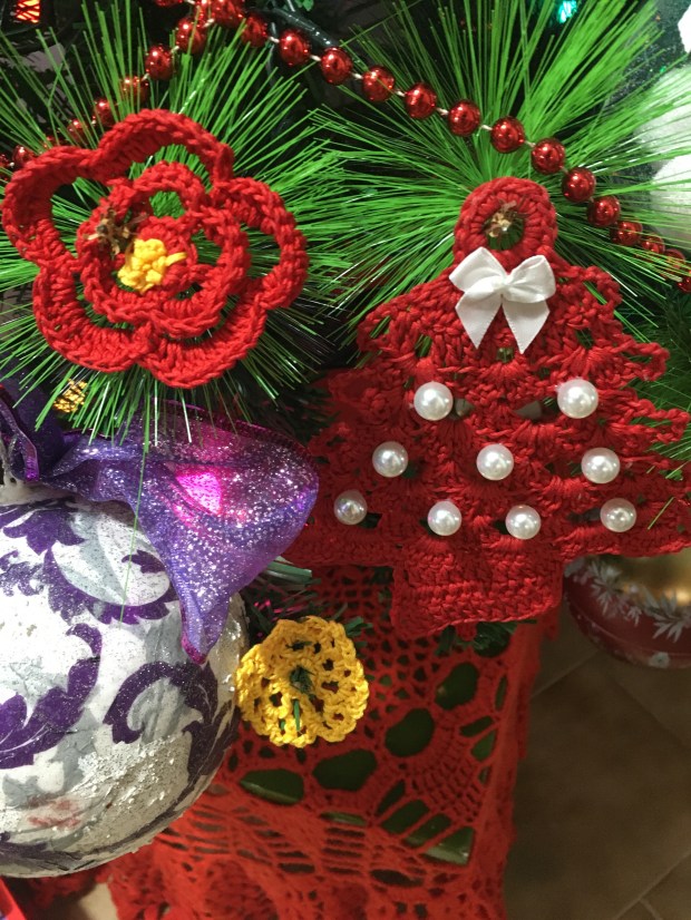 Un albero finto è orribile, ma ogni volta che ne abbiamo comprato uno vero, a casa nostra, dopo qualche giorno muore per il caldo. Purtroppo meglio lui che noi vecchierelli. Le palline sono quasi tutte di una vita fa che raccontano la crescita della prole. Le decorazioni sono fatte ad uncinetto ed ogni anno aggiungo una nuova forma. Non è nulla di eccezionale, ma è solo tutto nostro. Del resto meglio essere originale anche nell’ordinarietà!